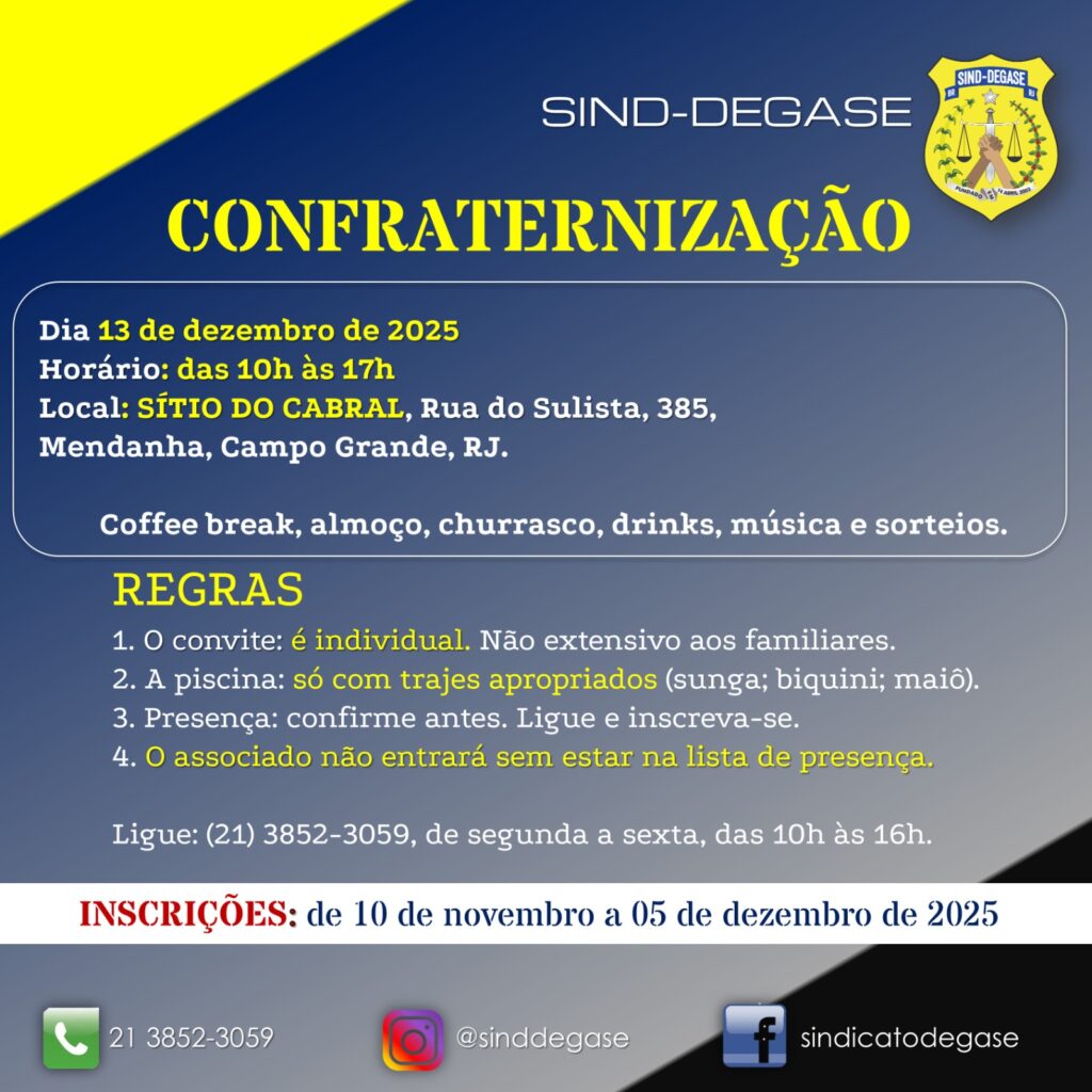 ⏱️O período de inscrições para a festa de confraternização terá início no dia 10 de novembro e se encerrará em 05 de dezembro.